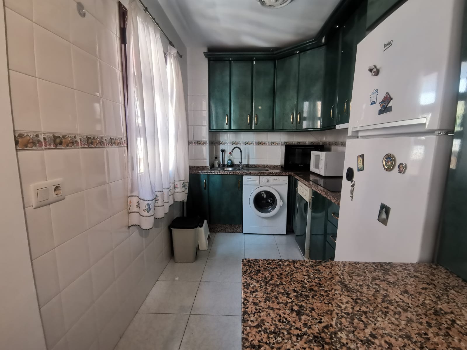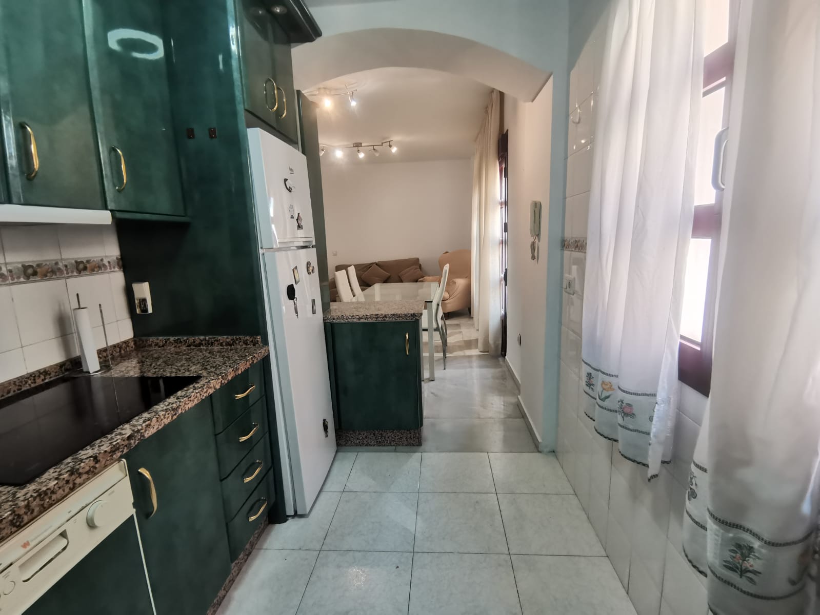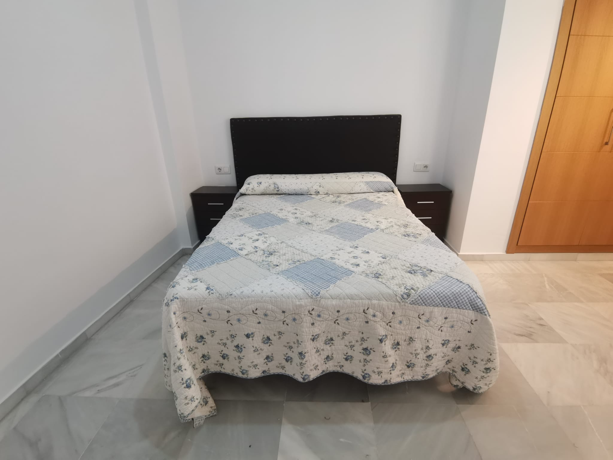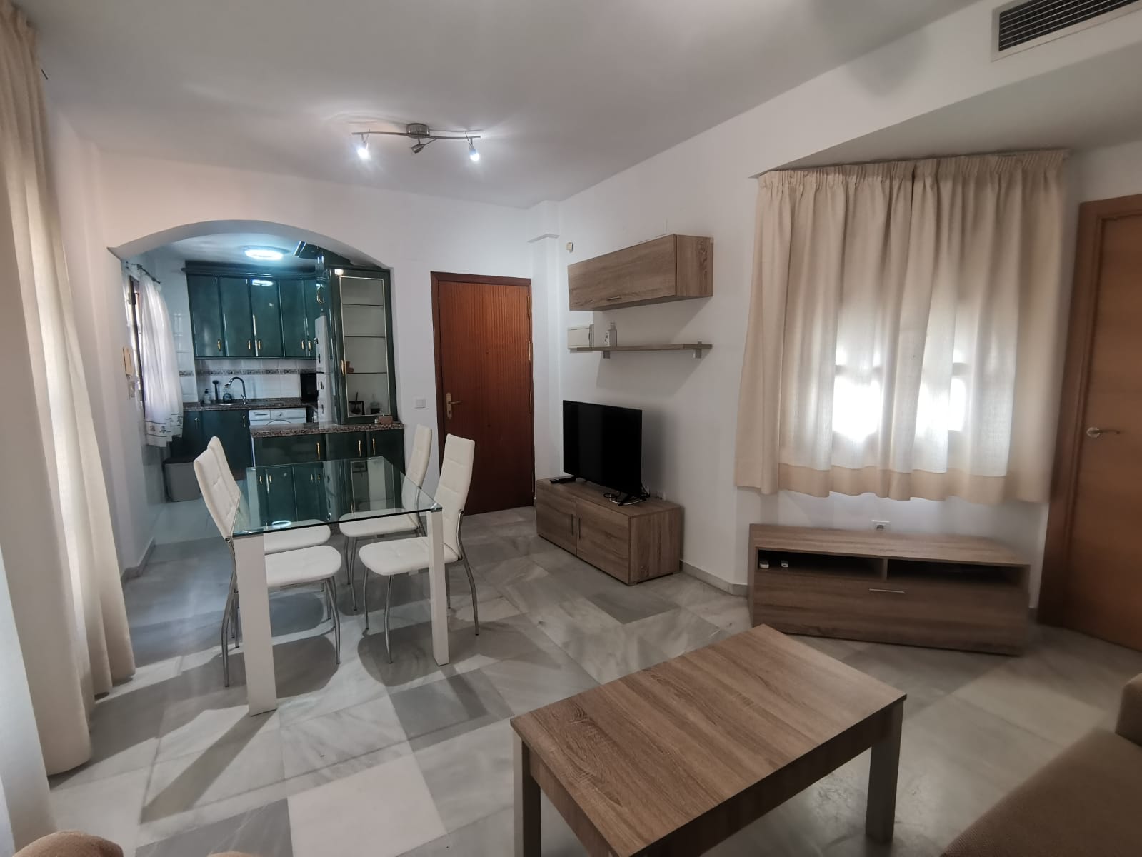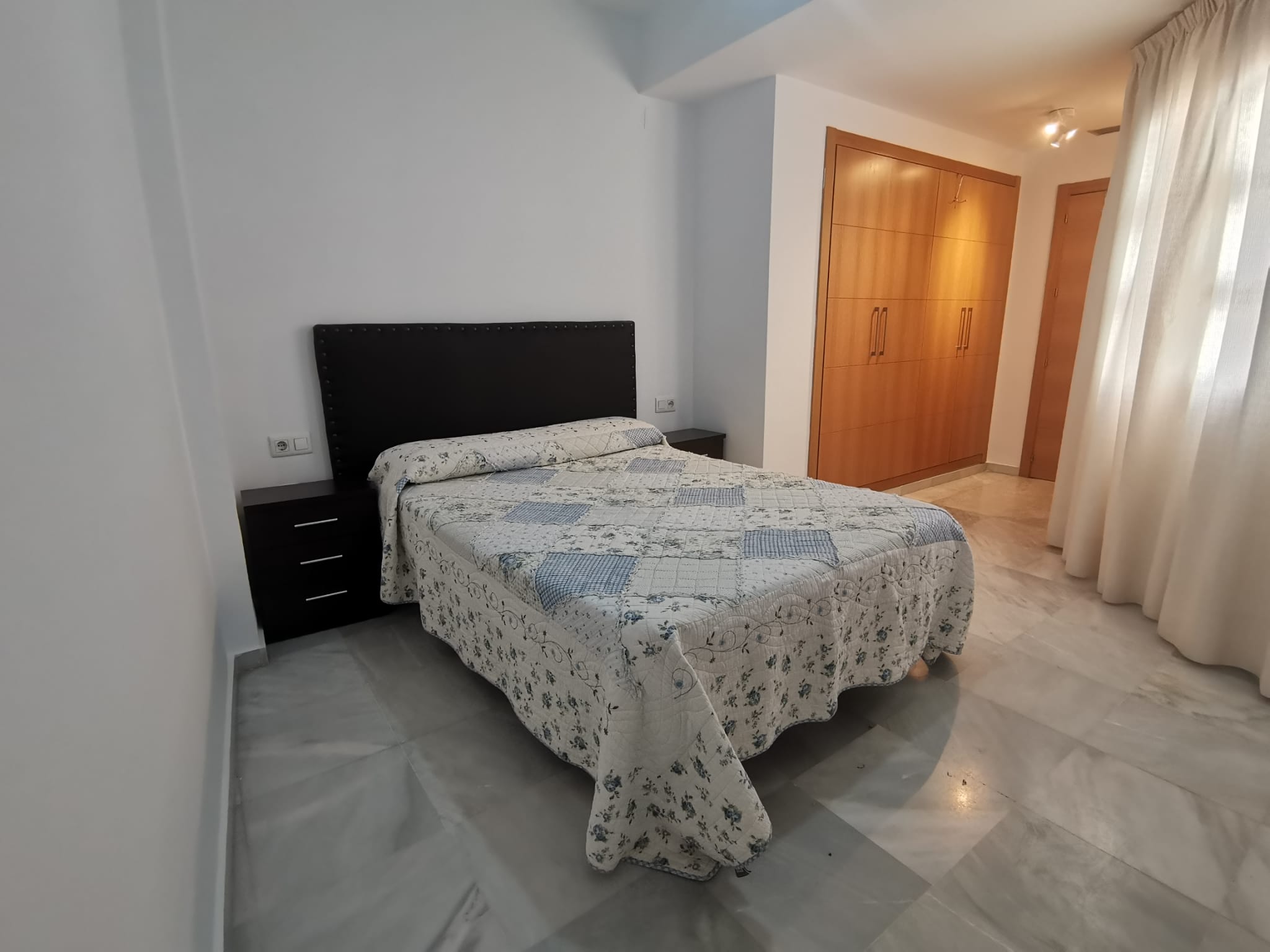 Apartamento de 60 m2 de un dormitorio, amplio, bien distribuido en salón comedor exterior, cocina independiente, dormitorio con armario empotrado, vitrocerámica, lavavajillas, lavadora, frigorífico, un cuarto de baño en mármol con bañera, dormitorio con armario empotrado, cama de 135 cm, aire acondicionado centralizado y termo eléctrico. Carpintería de madera en color cerezo, suelo de mármol y ventanas de climalit.