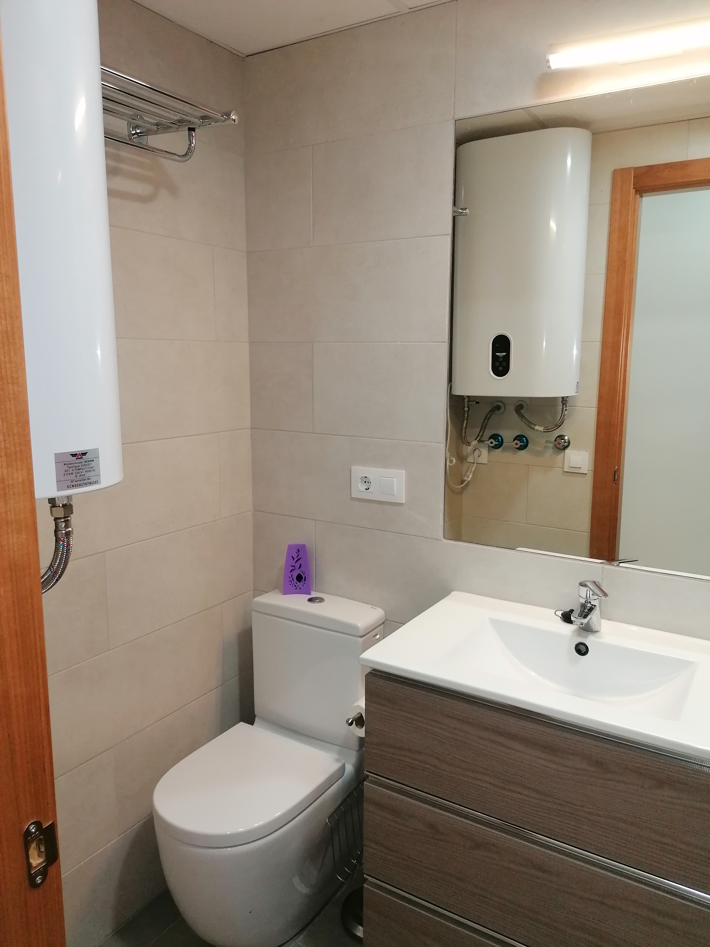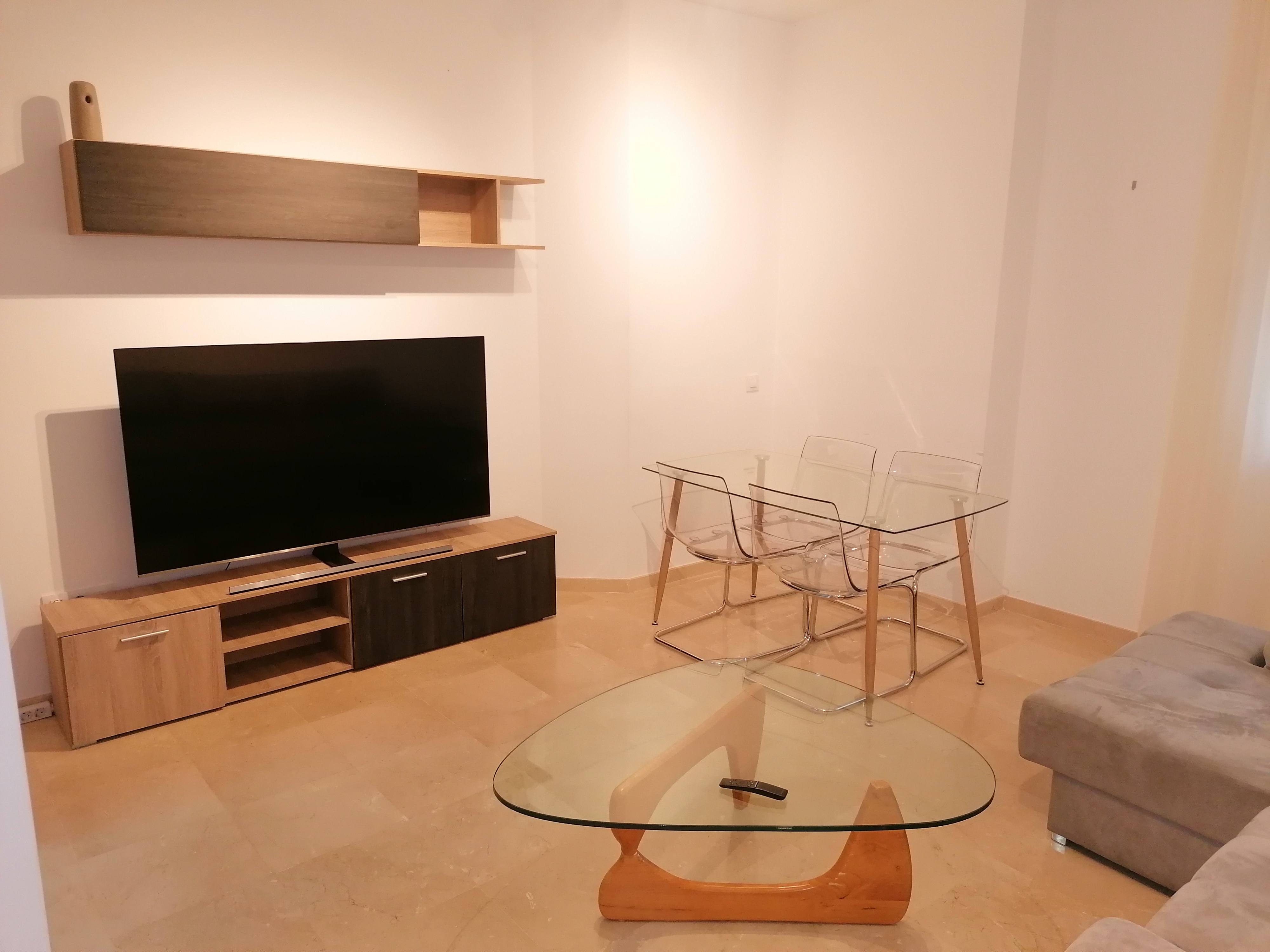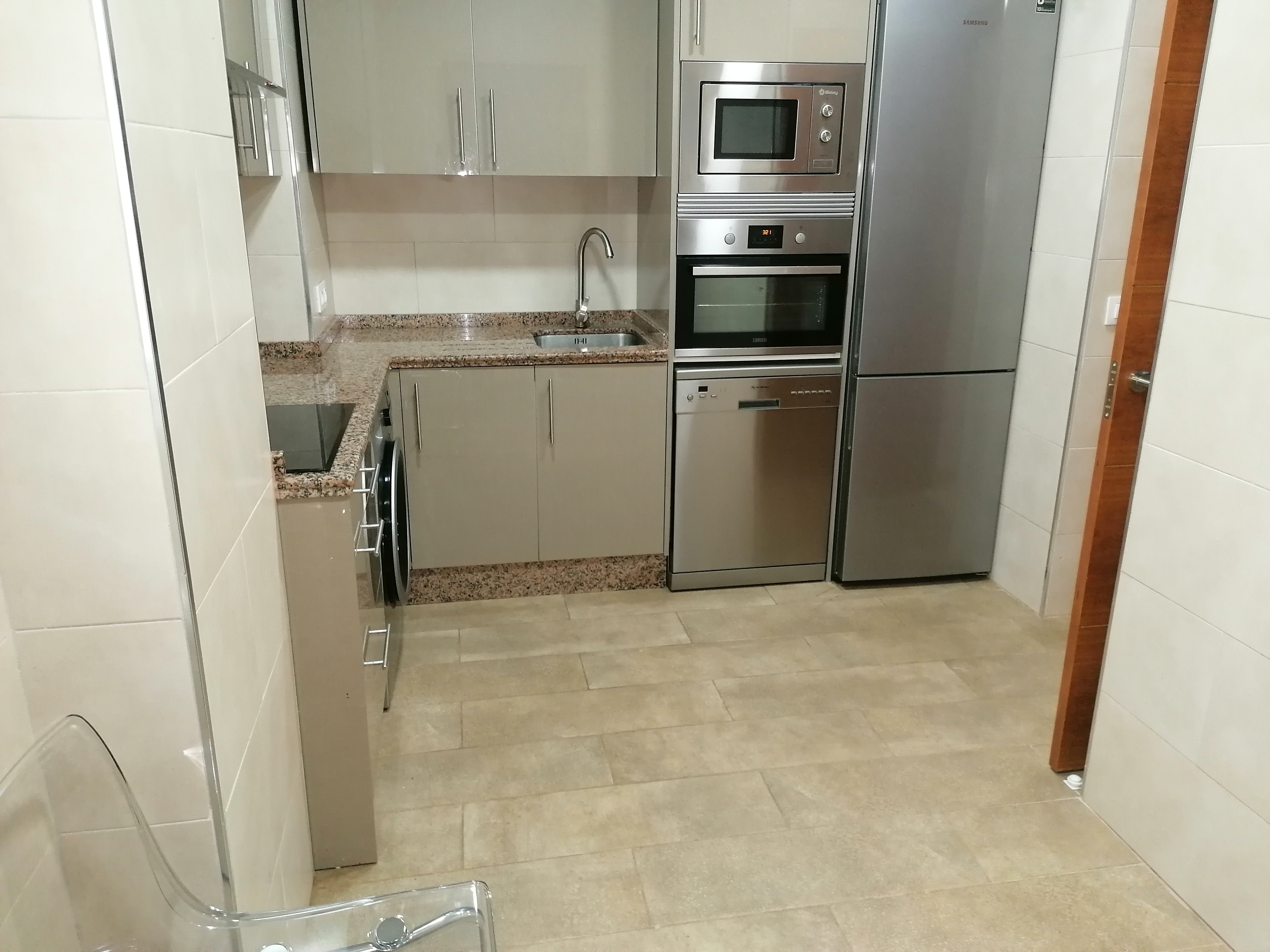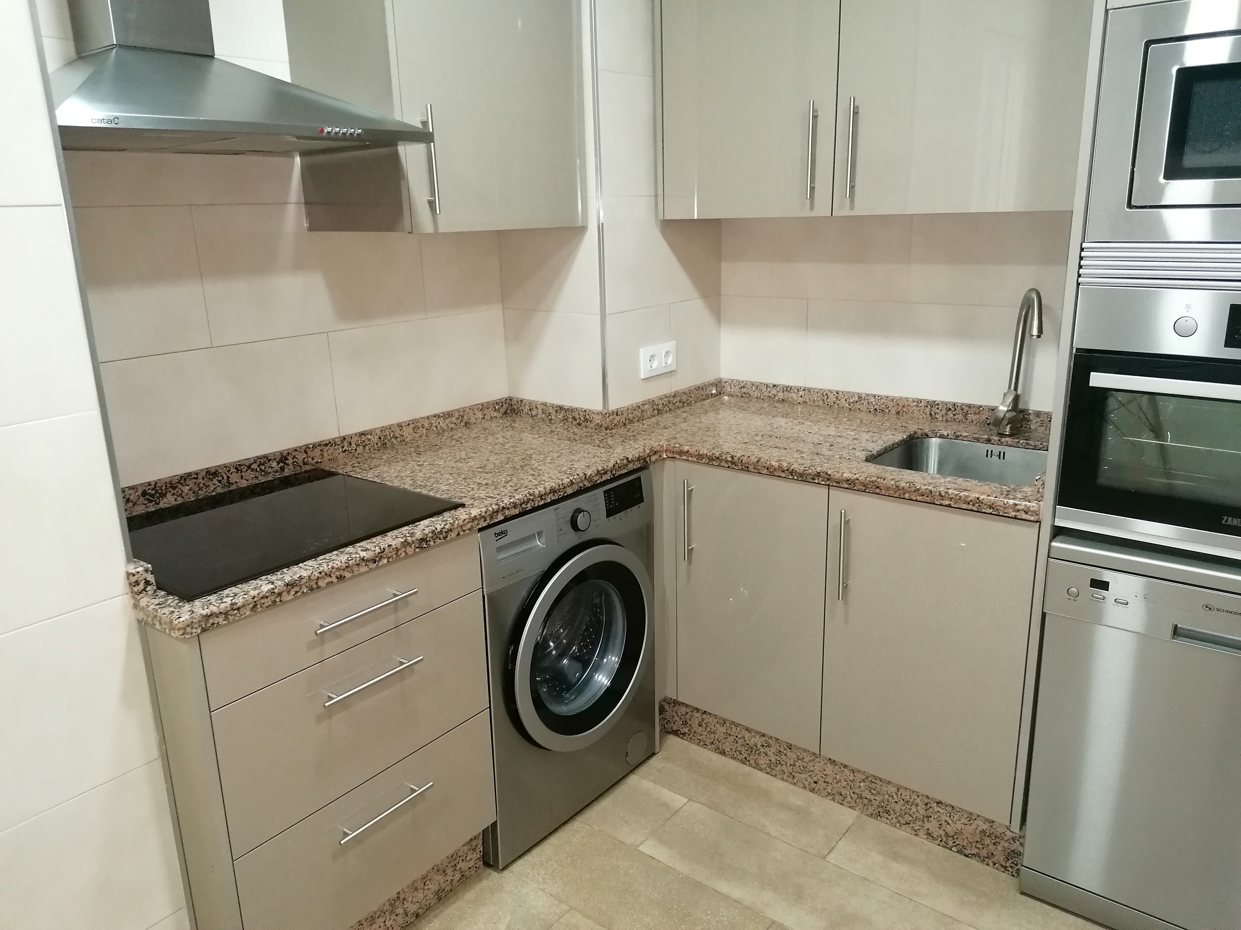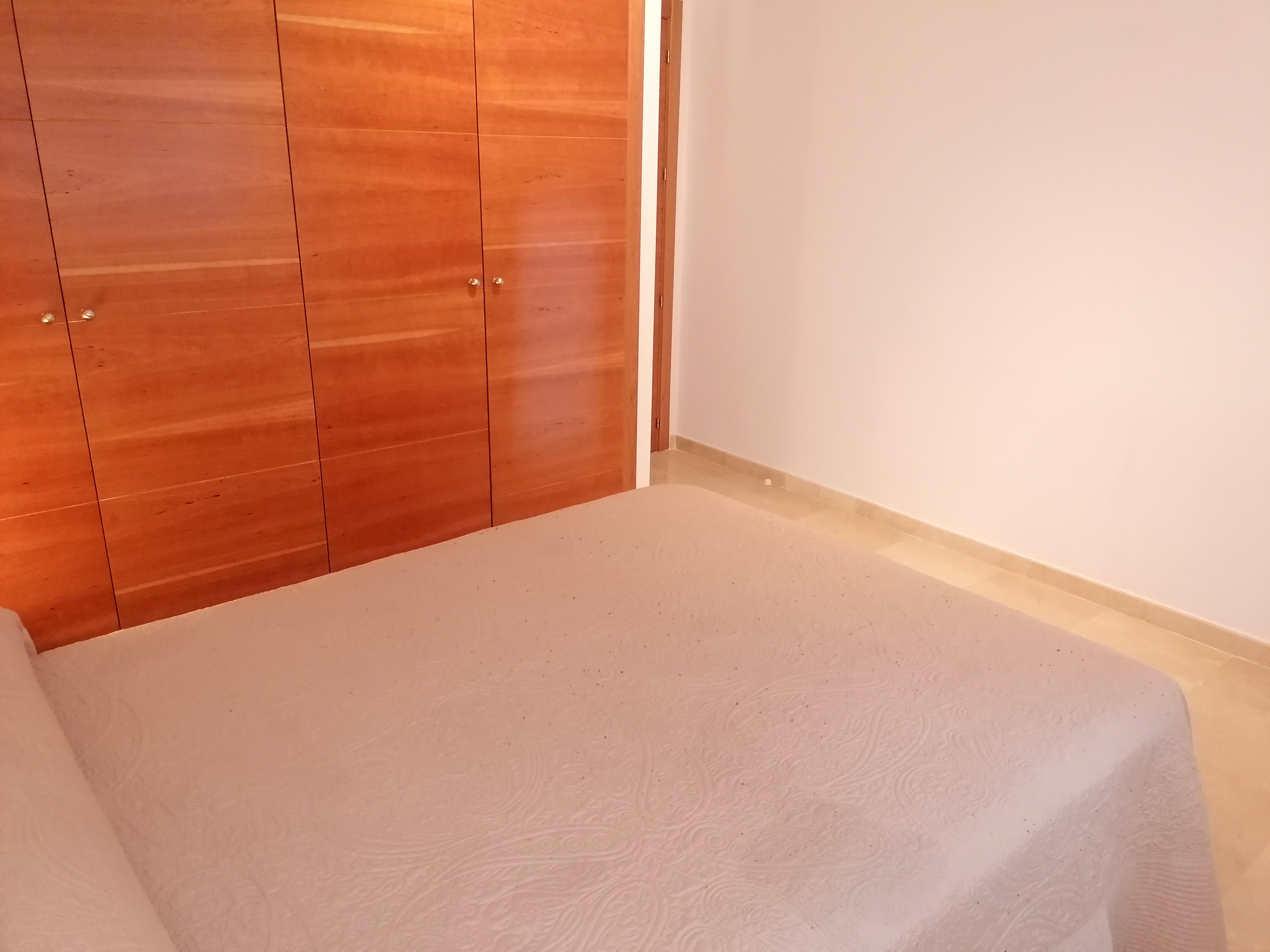 Piso de 80 m2 en planta baja, se alquila amueblado, distribuido en salón comedor exterior, cocina independiente, climatizada con vitrocerámica de inducción y electrodomésticos de primeras marcas, pasillo que conecta a las demás estancias privadas, dos cuartos de baño con bañera y plato de ducha, y dos dormitorios con armarios empotrados, camas de 135 cm. Con conexión de antena TV y teléfono en todas las habitaciones, aire acondicionado centralizado y termo eléctrico. Carpintería de madera en color cerezo, suelo de mármol crema marfil y ventanas de climalit.