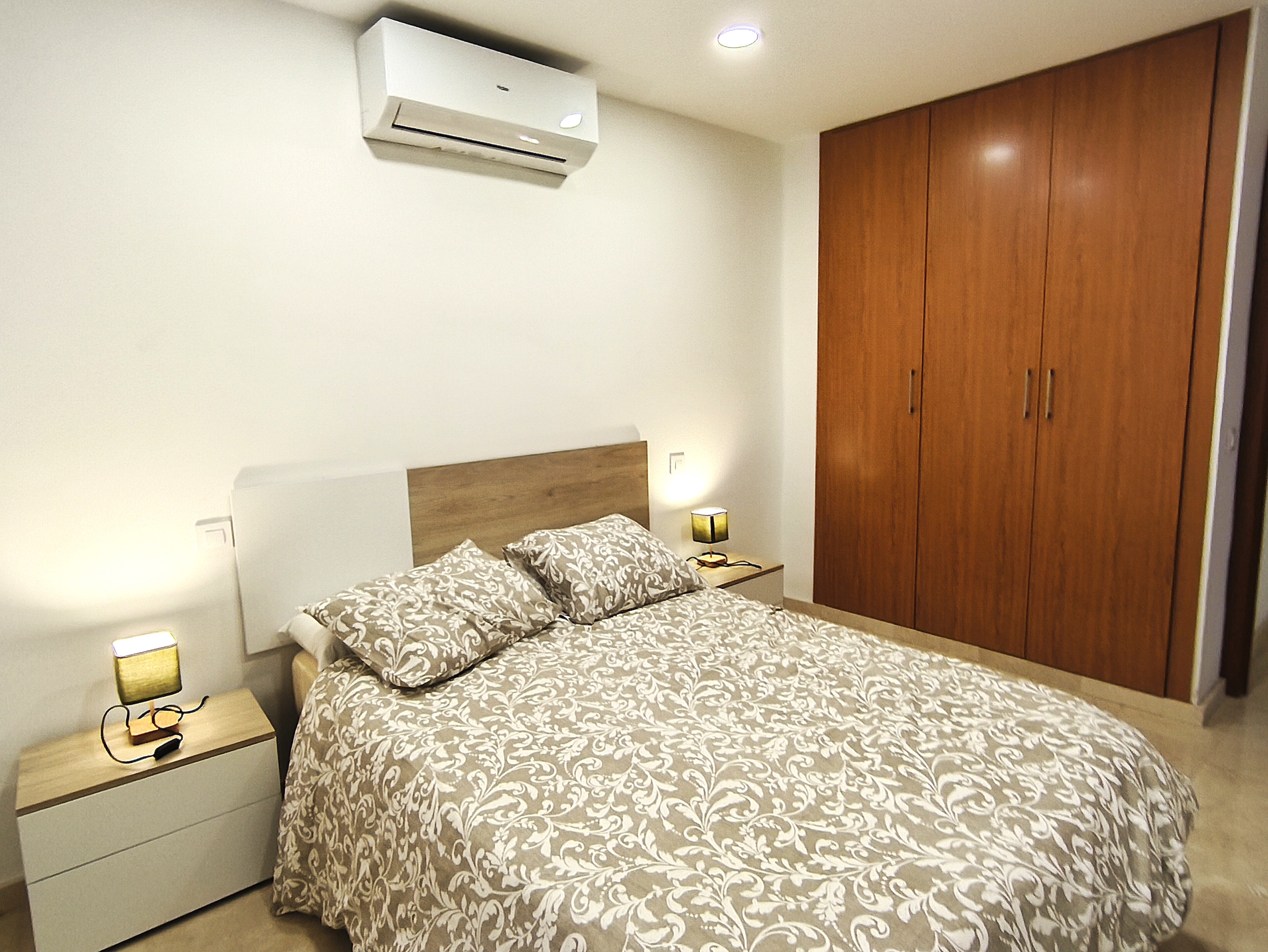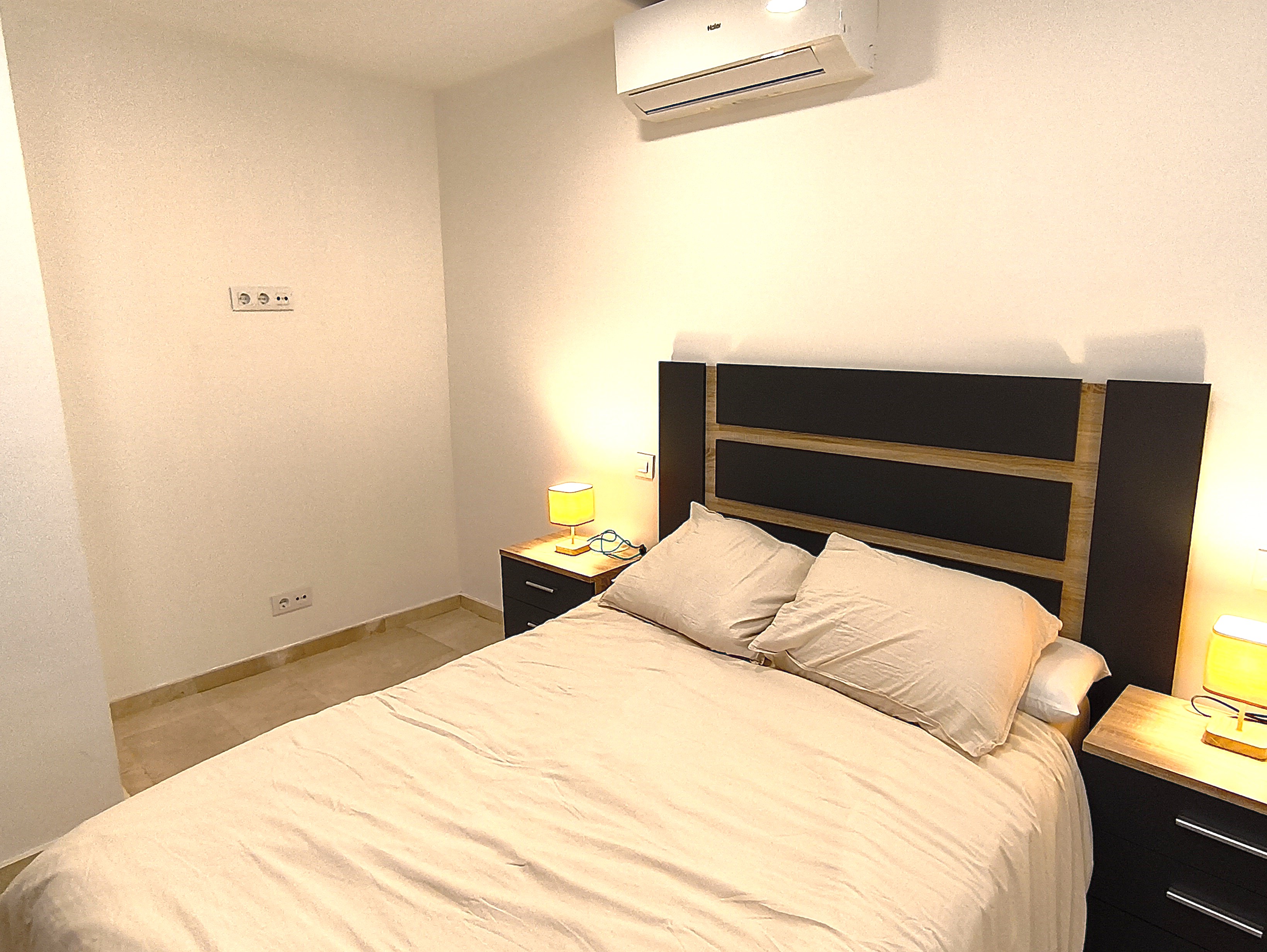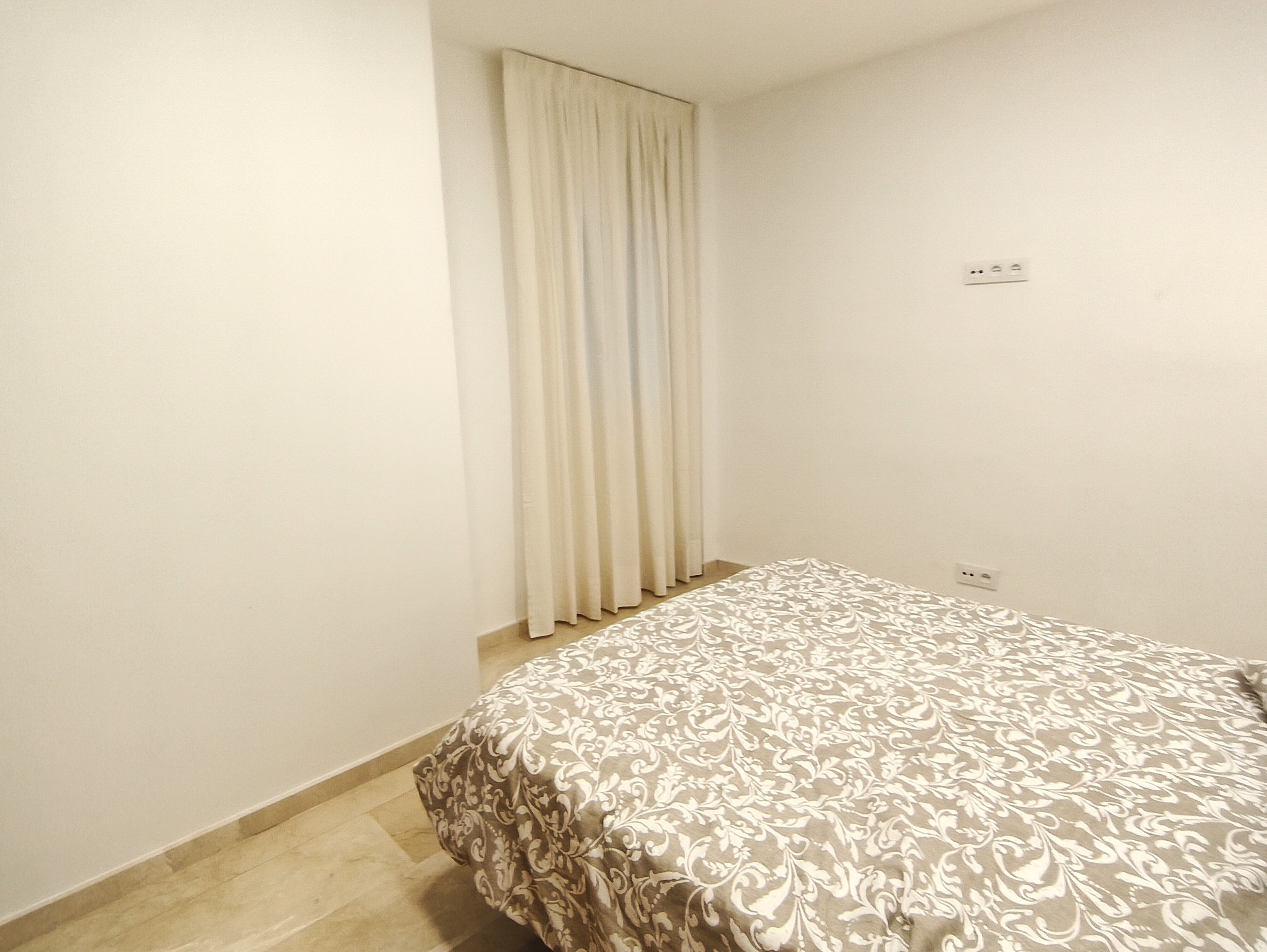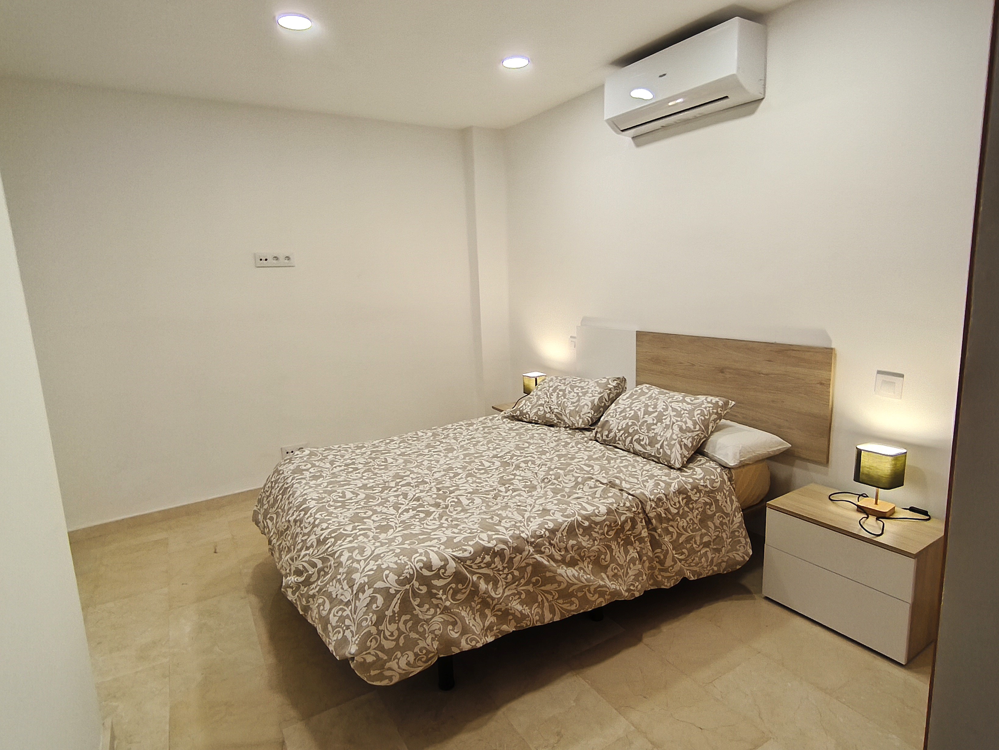 Piso de dos dormitorios y 65 m2 con calidades de primera, suelos de mármol crema marfil, cocina americana y salón, baño, dos amplios dormitorios con armarios empotrados, patio de uso privado y parking en superficie.