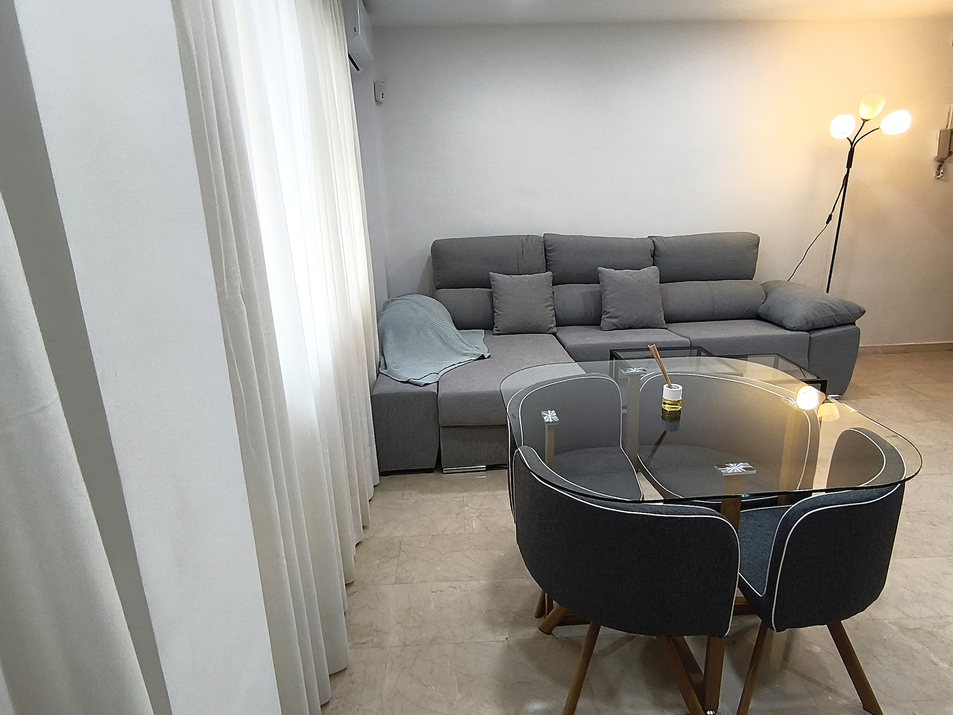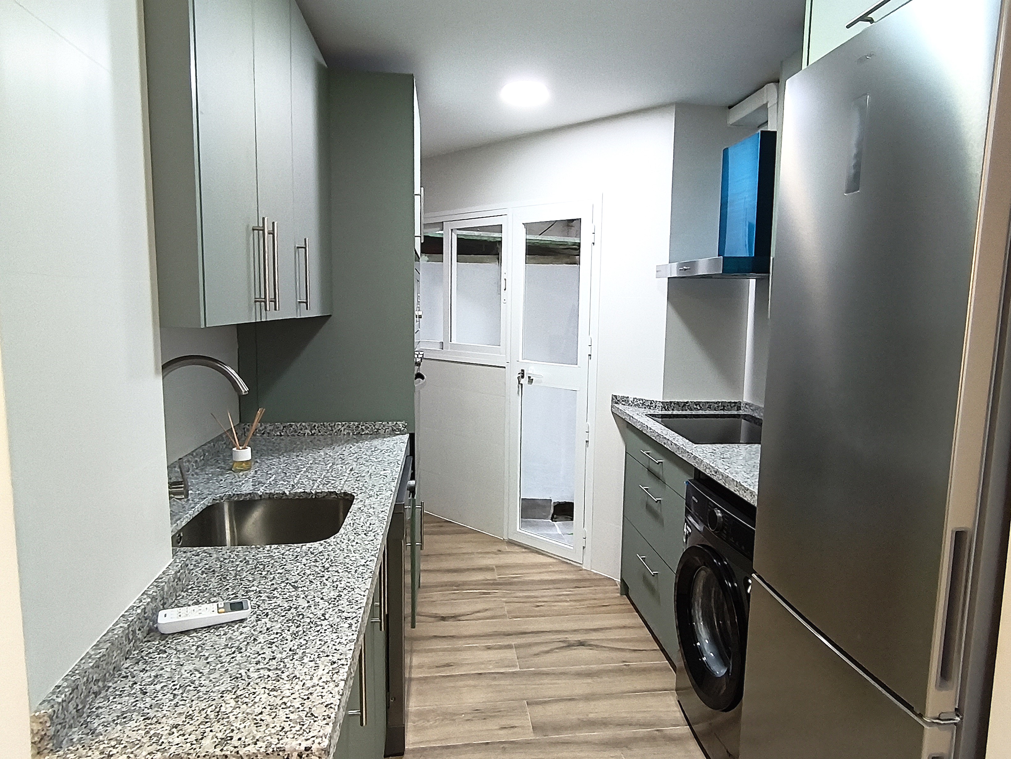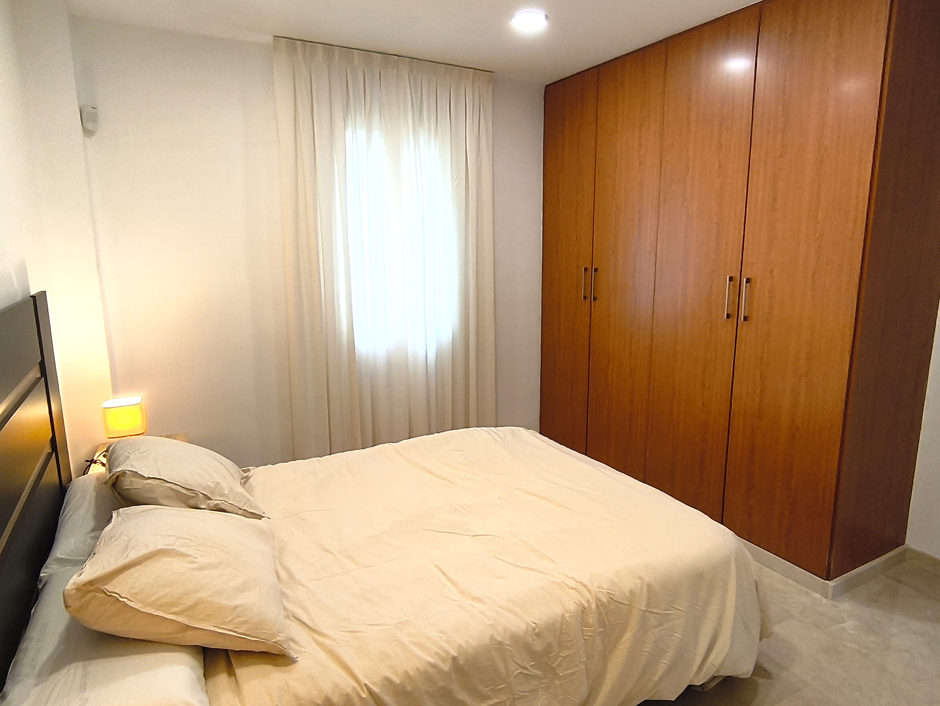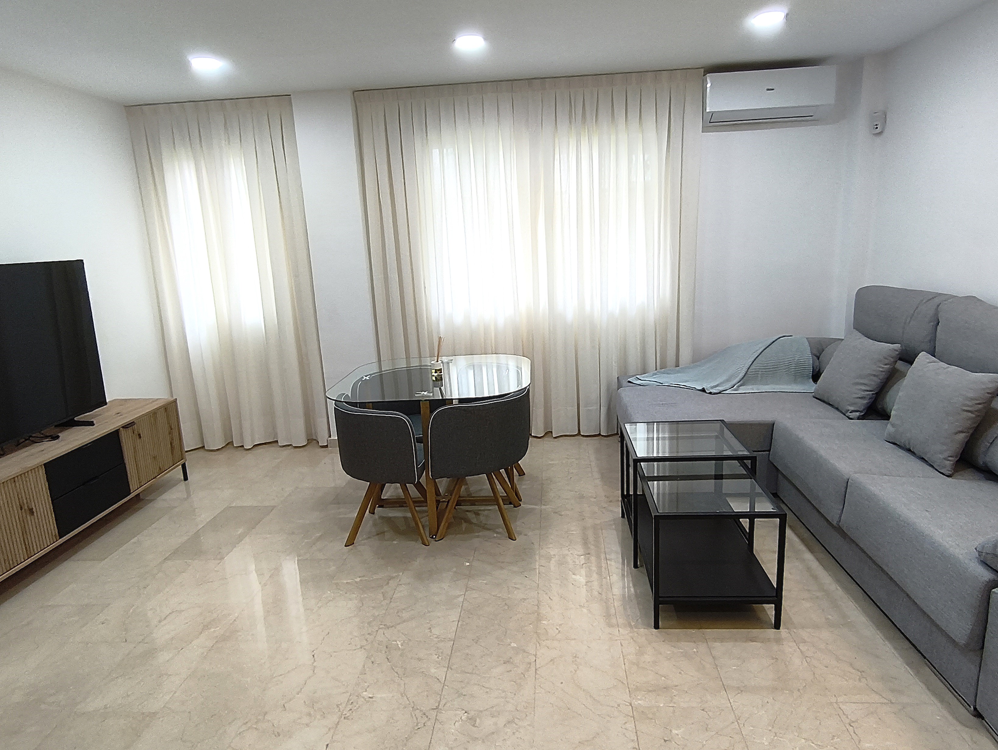 Piso de dos dormitorios y 65 m2 con calidades de primera, suelos de mármol crema marfil, cocina americana y salón, baño, dos amplios dormitorios con armarios empotrados, patio de uso privado y parking en superficie.