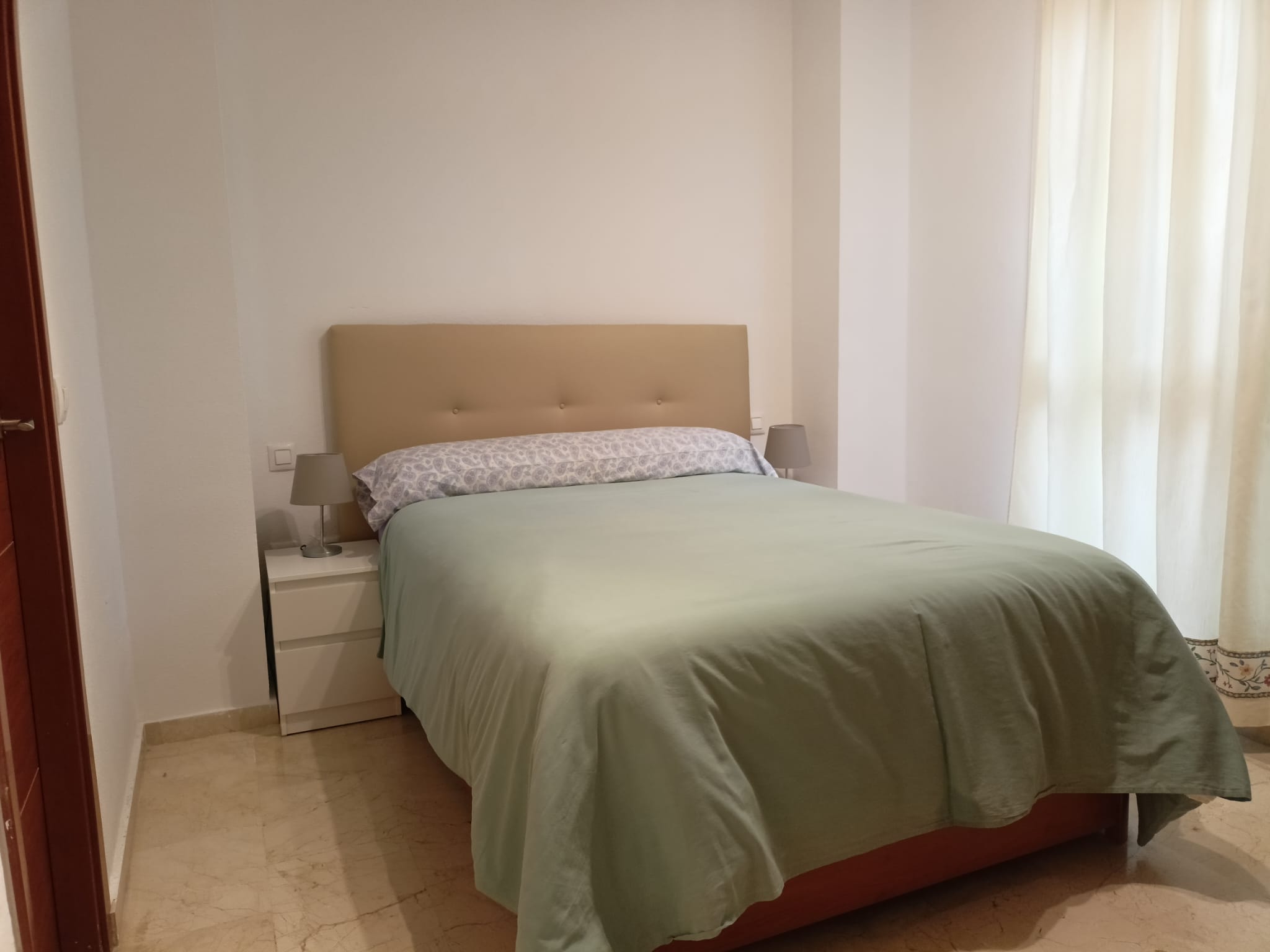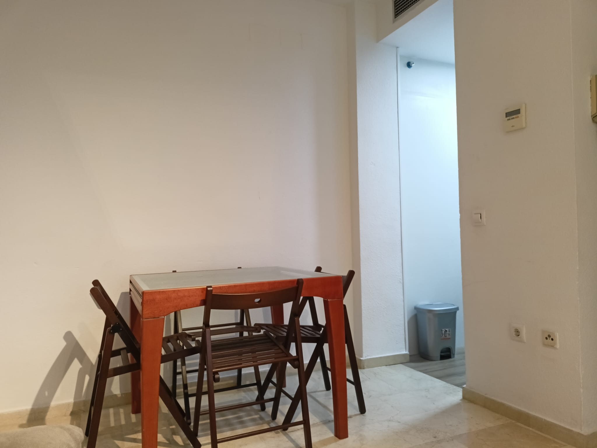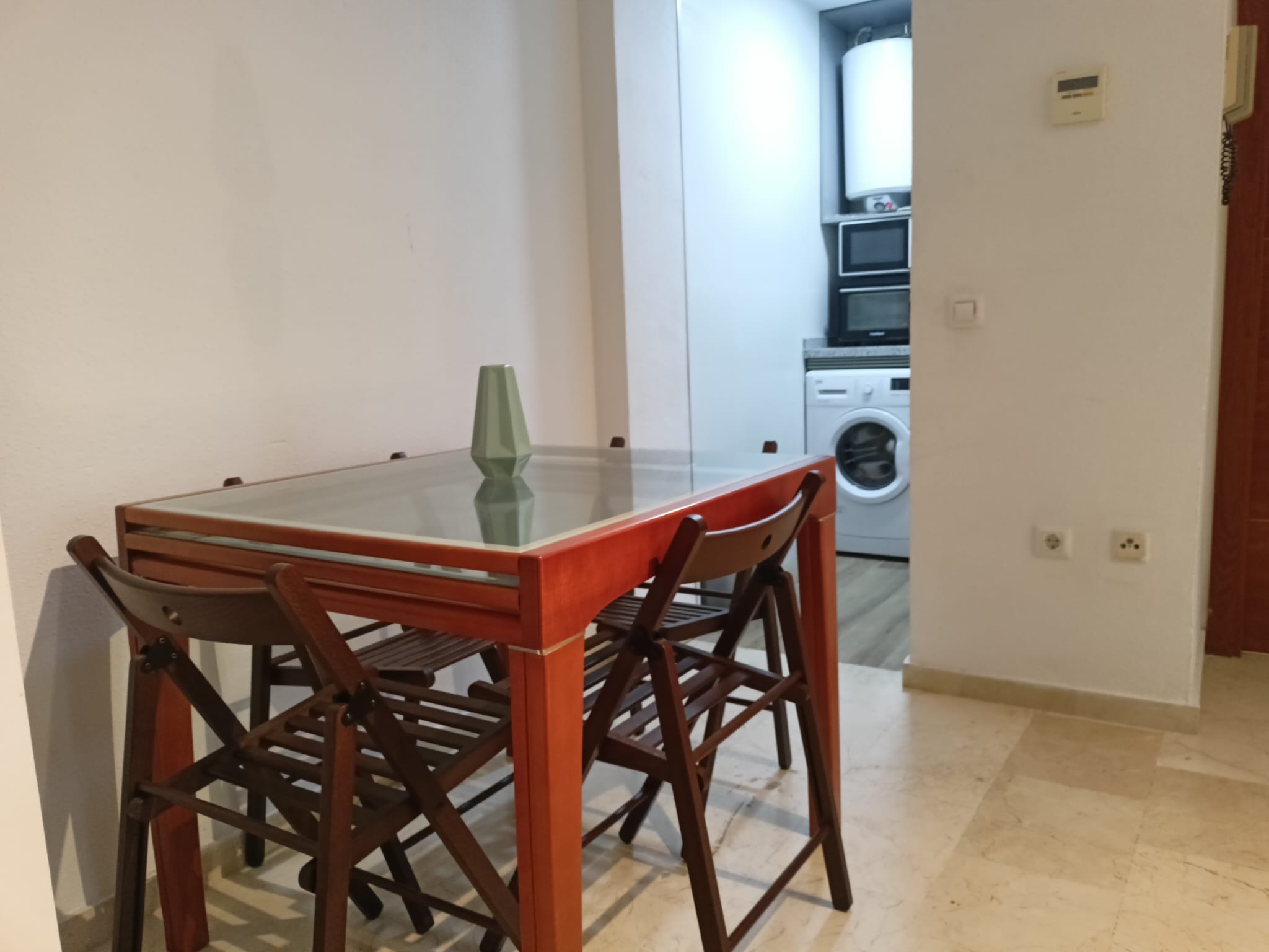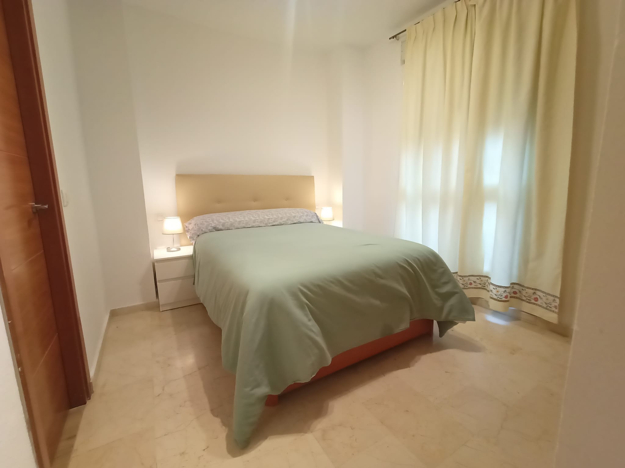 Apartamento de 50 m2 en primera planta con ascensor, muy luminoso, bien distribuido en salón comedor exterior, cocina, vitrocerámica, lavavajillas, lavadora, frigorífico, un cuarto de baño con bañera, dormitorio con armario empotrado, cama de 135 cm, aire acondicionado centralizado y termo eléctrico. Carpintería de madera en color cerezo, suelo de mármol y ventanas de climalit.