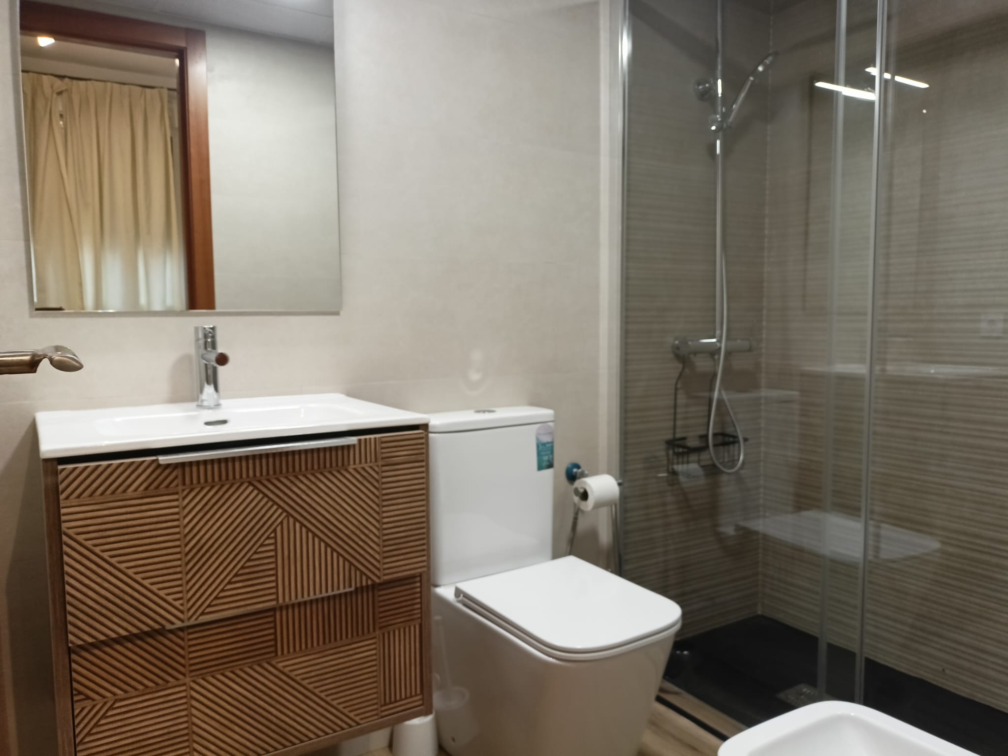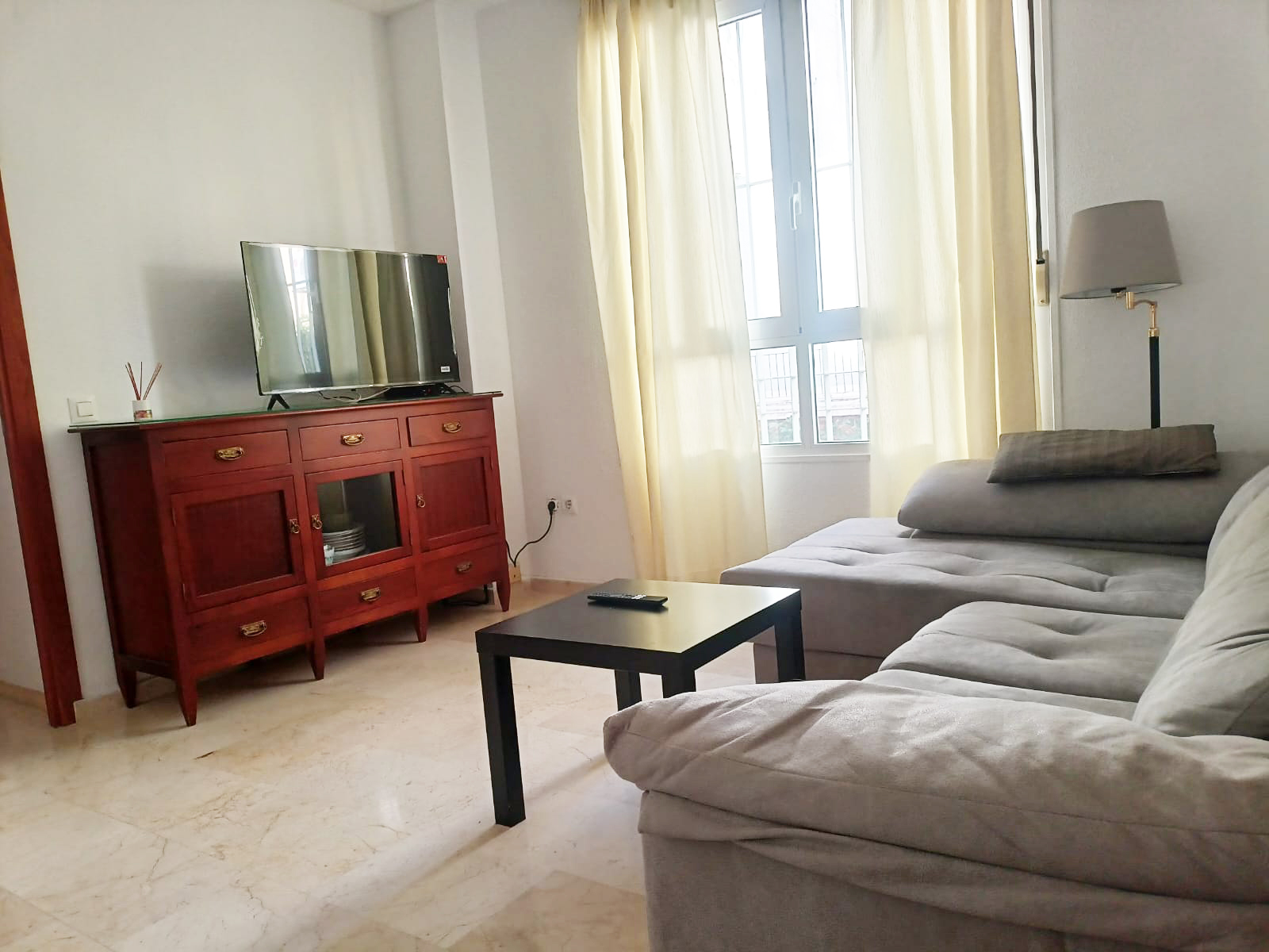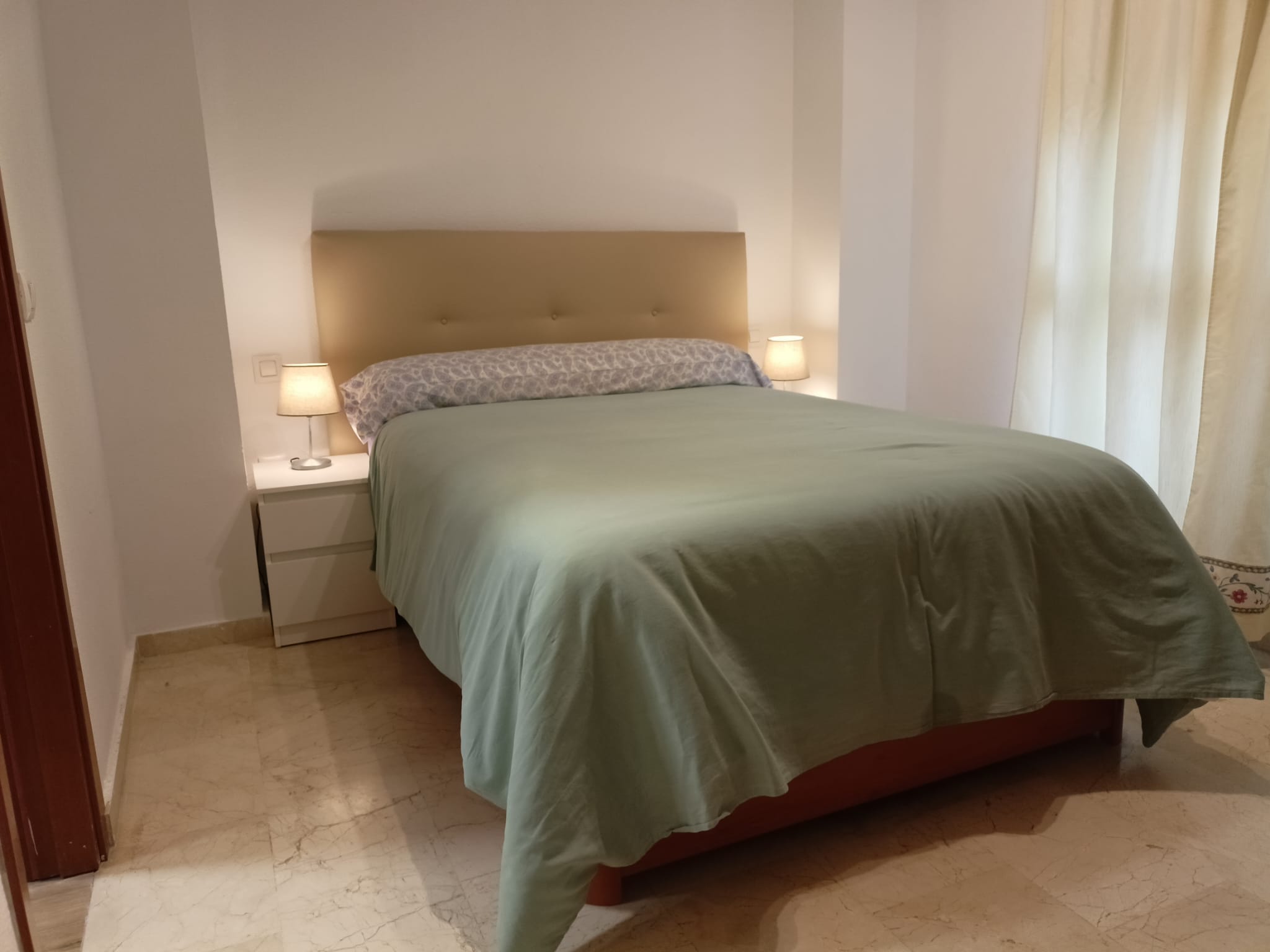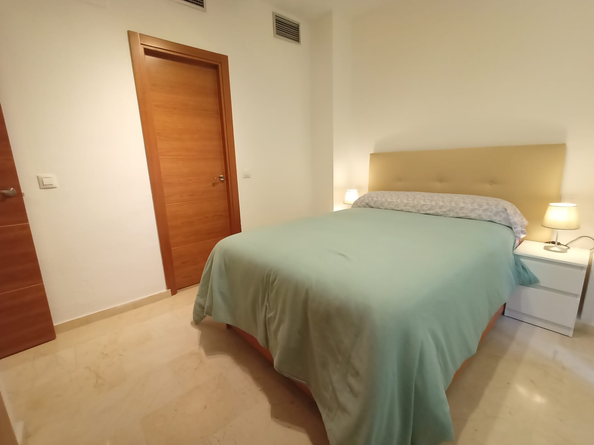Apartamento de 50 m2 en primera planta con ascensor, muy luminoso, bien distribuido en salón comedor exterior, cocina, vitrocerámica, lavavajillas, lavadora, frigorífico, un cuarto de baño con bañera, dormitorio con armario empotrado, cama de 135 cm, aire acondicionado centralizado y termo eléctrico. Carpintería de madera en color cerezo, suelo de mármol y ventanas de climalit.