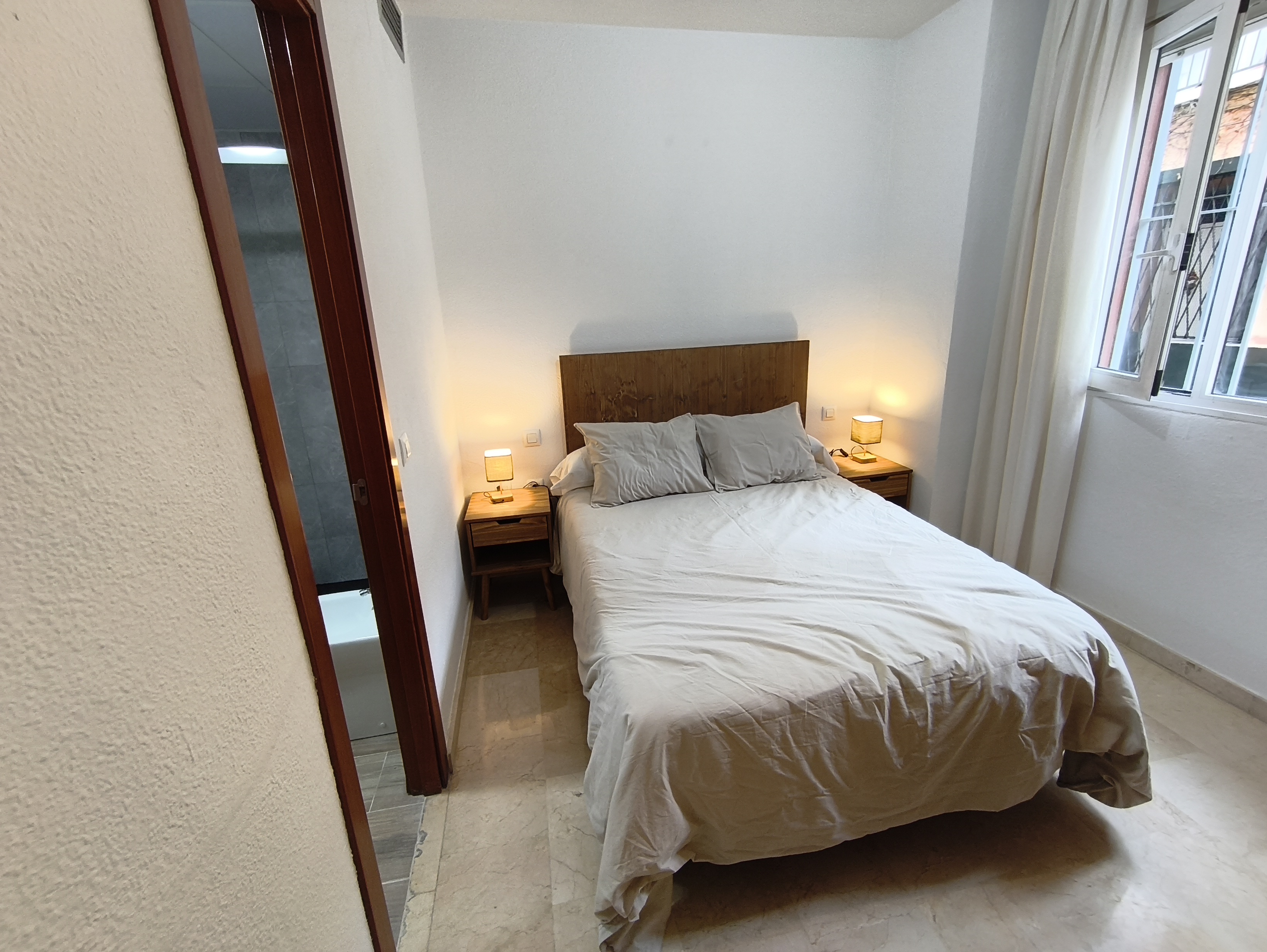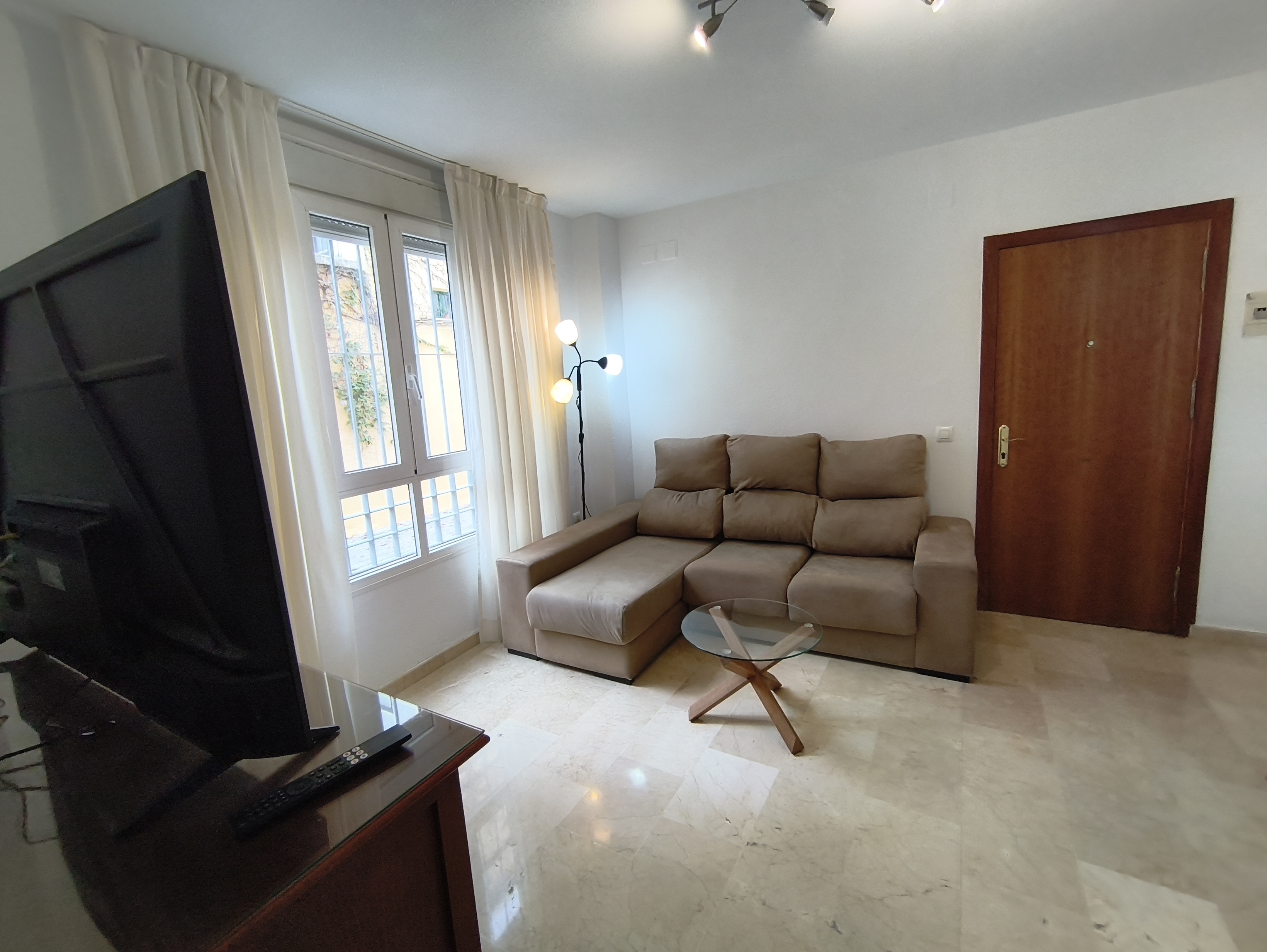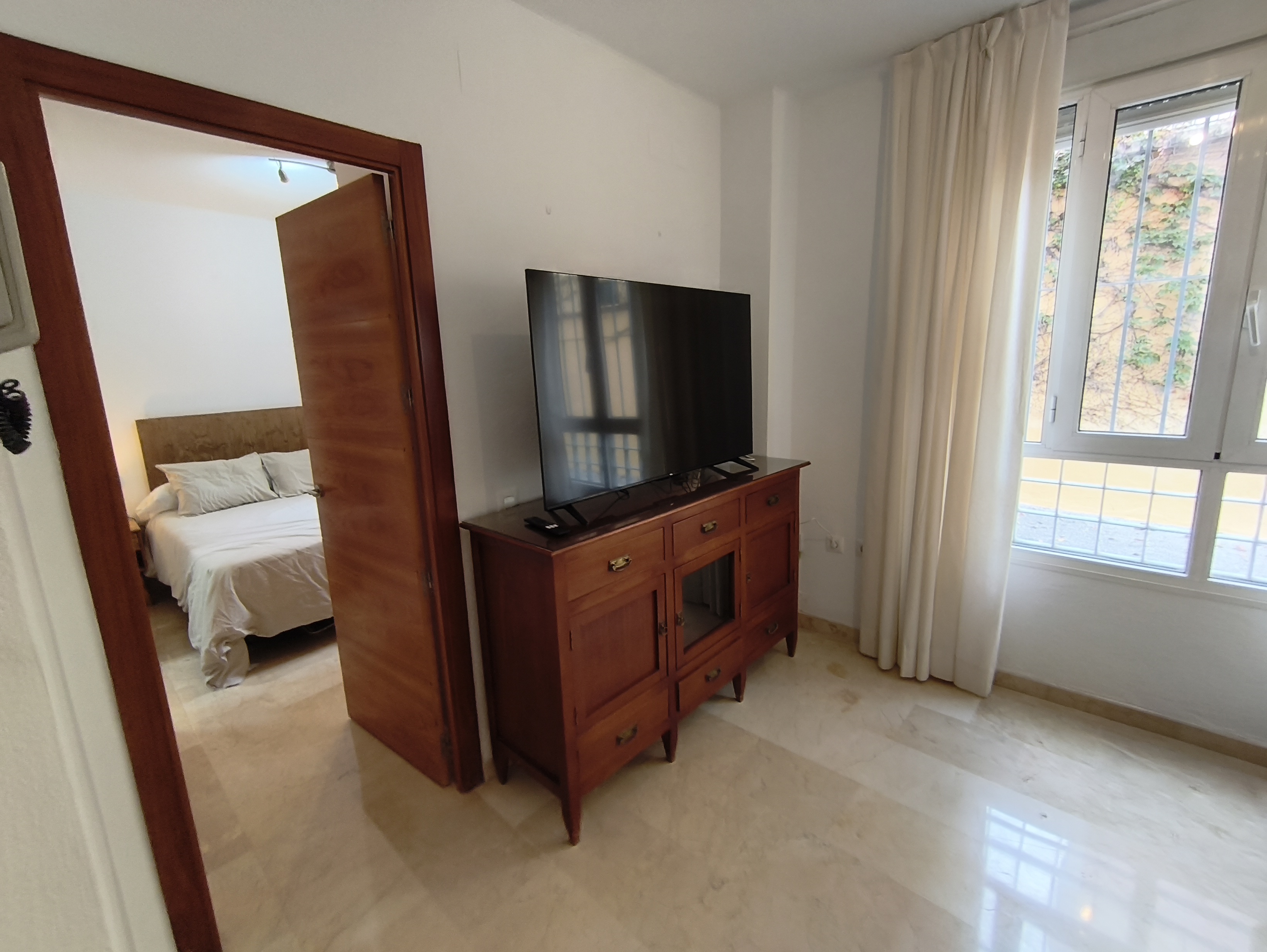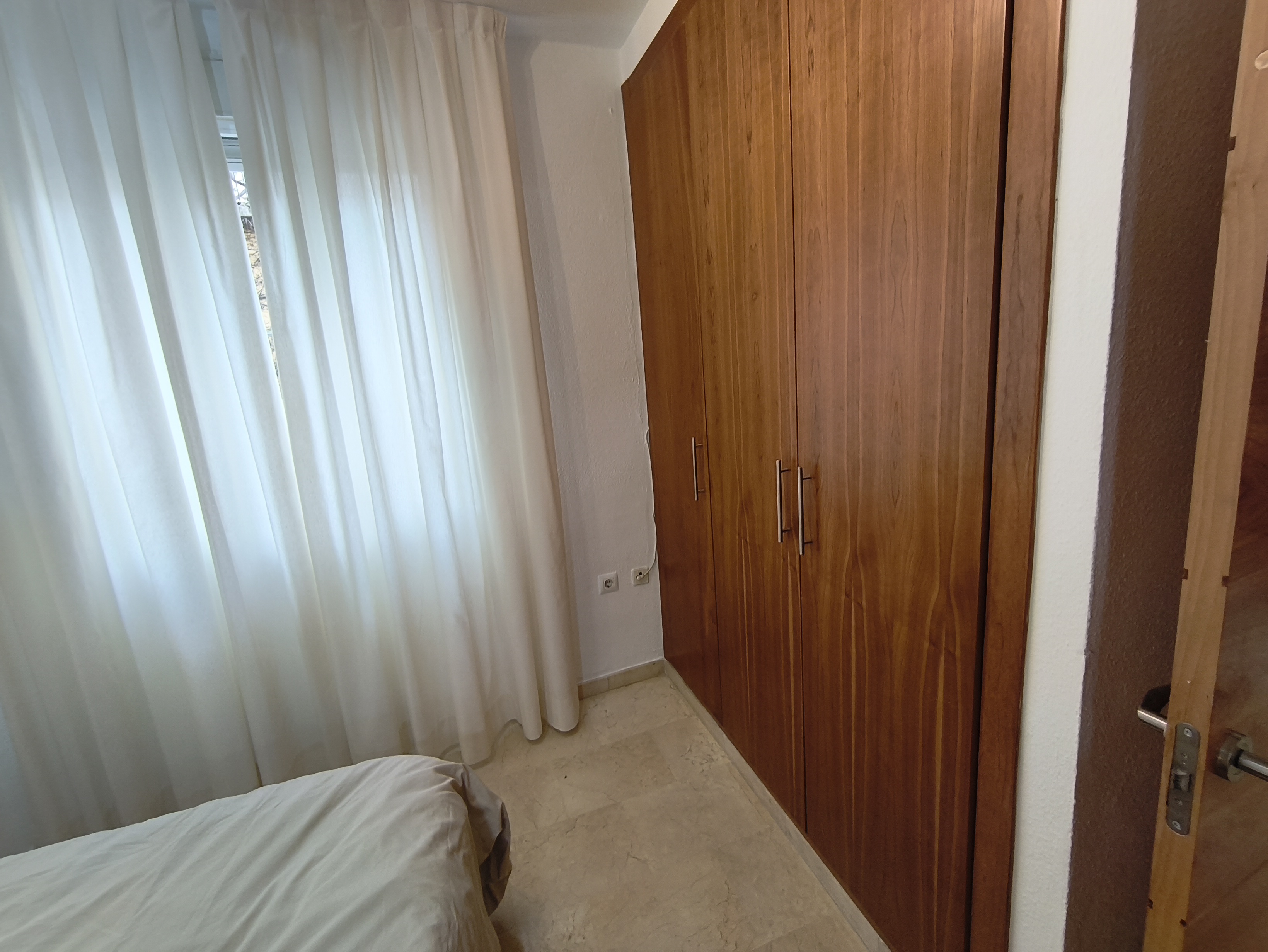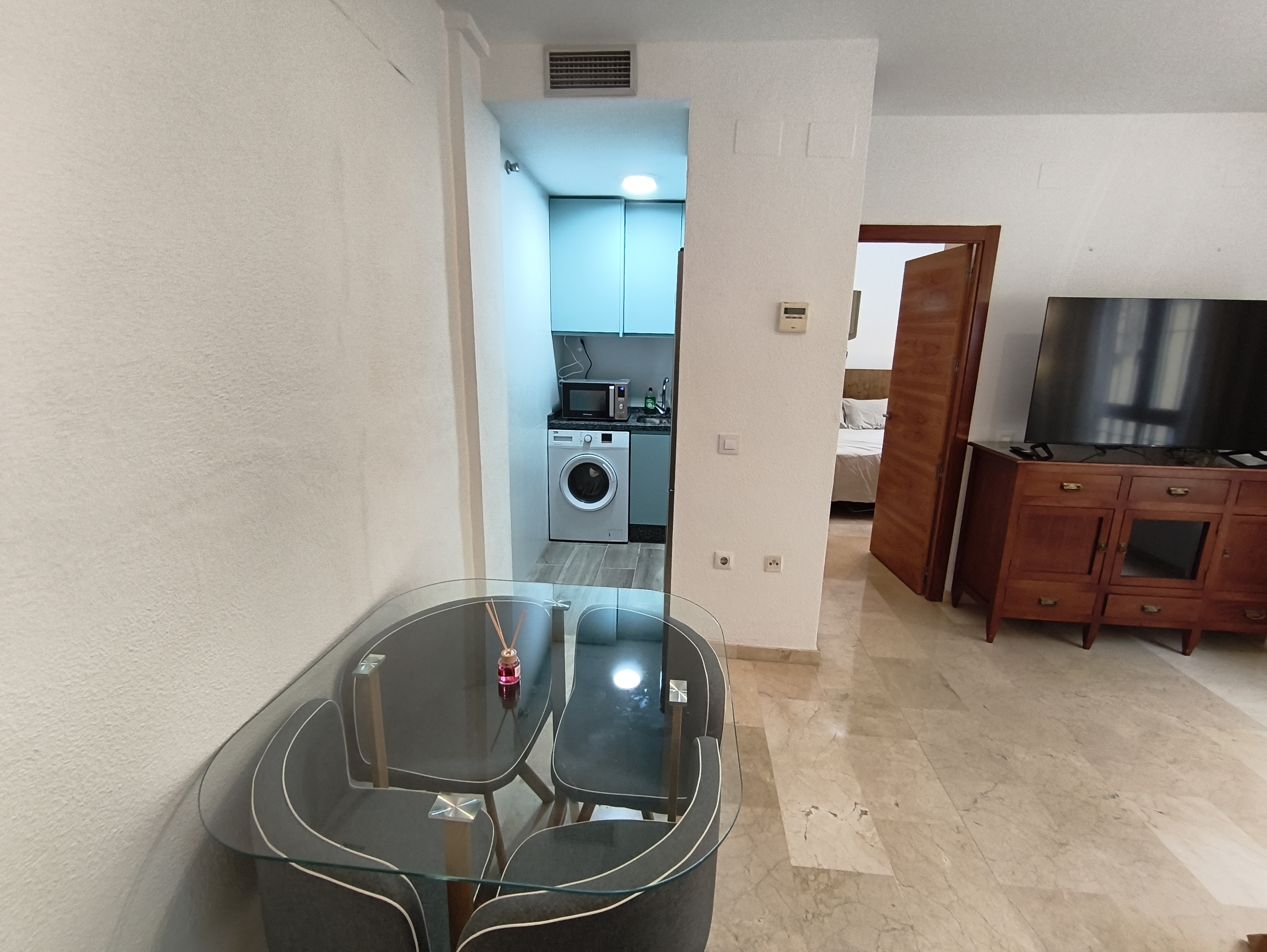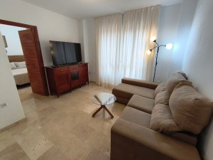 Apartamento de 50 m2 en planta baja, muy luminoso, bien distribuido en salón comedor exterior, cocina, vitrocerámica, lavavajillas, lavadora, frigorífico, un cuarto de baño con bañera, dormitorio con armario empotrado, cama de 135 cm, aire acondicionado centralizado y termo eléctrico. Carpintería de madera en color cerezo, suelo de mármol y ventanas de climalit.