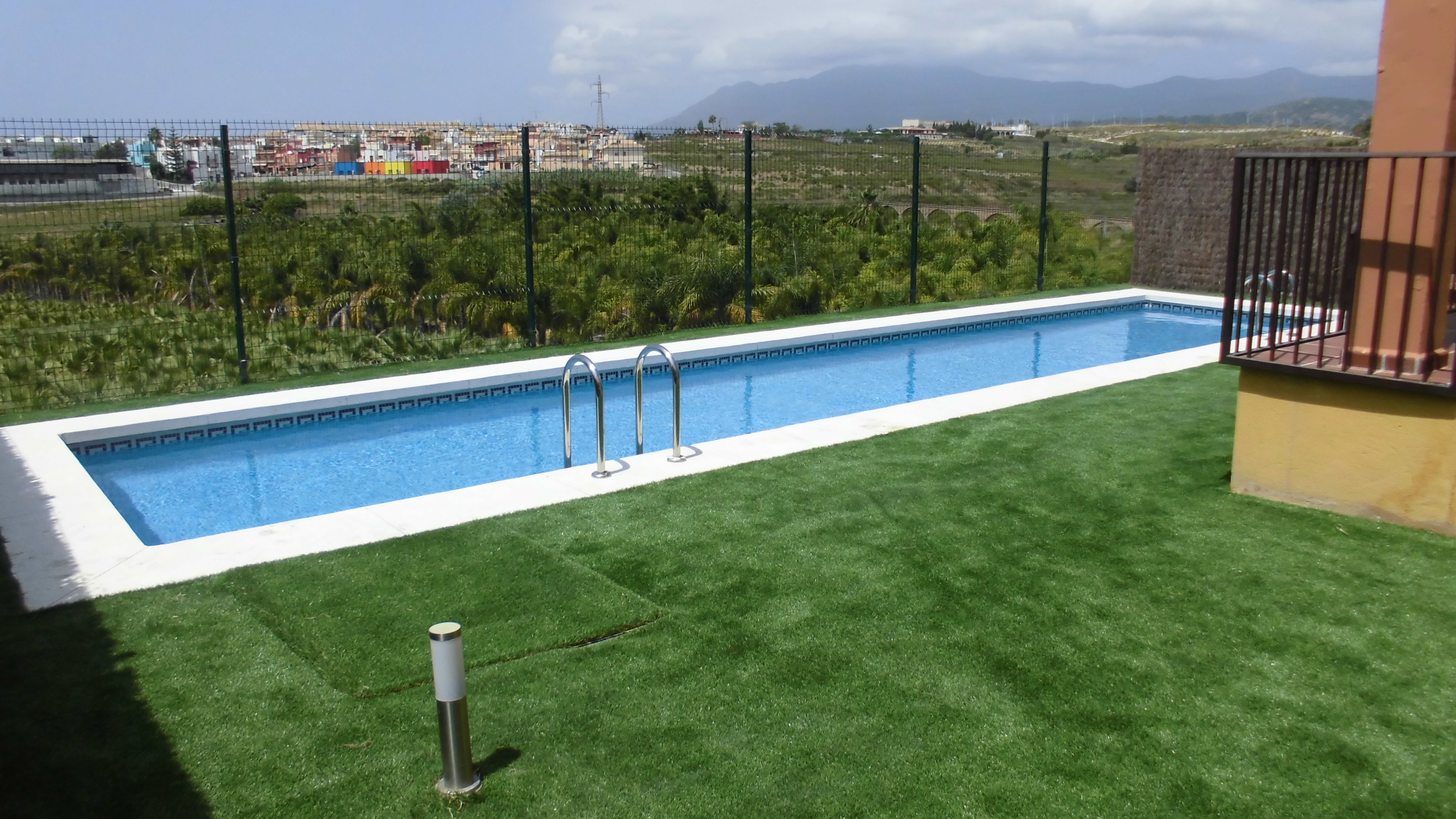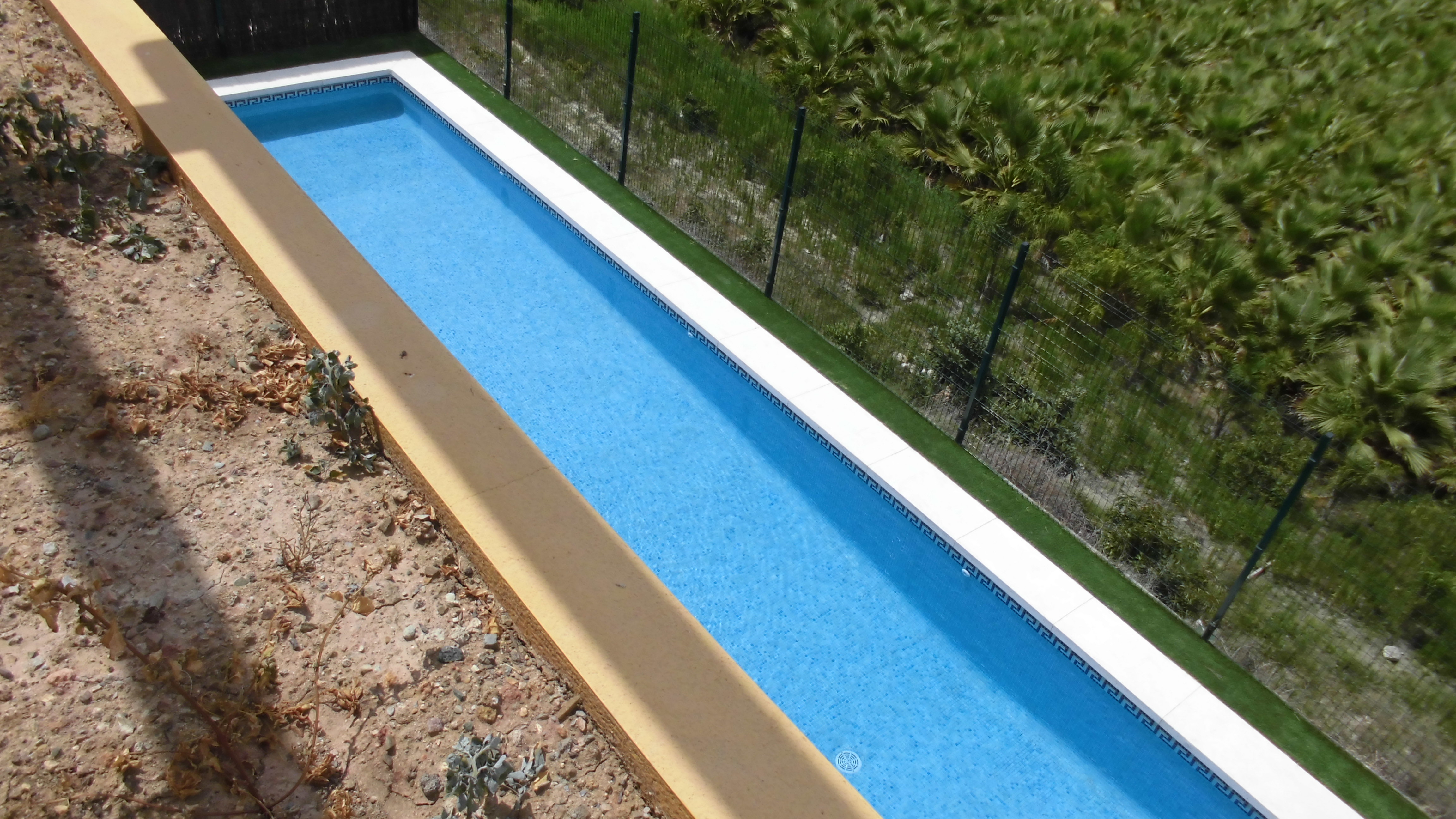 Vivienda de dos plantas construida en una parcela de 376 m2, con gran parking exterior para más de 1 coche, zona ajardinada y piscina privada.