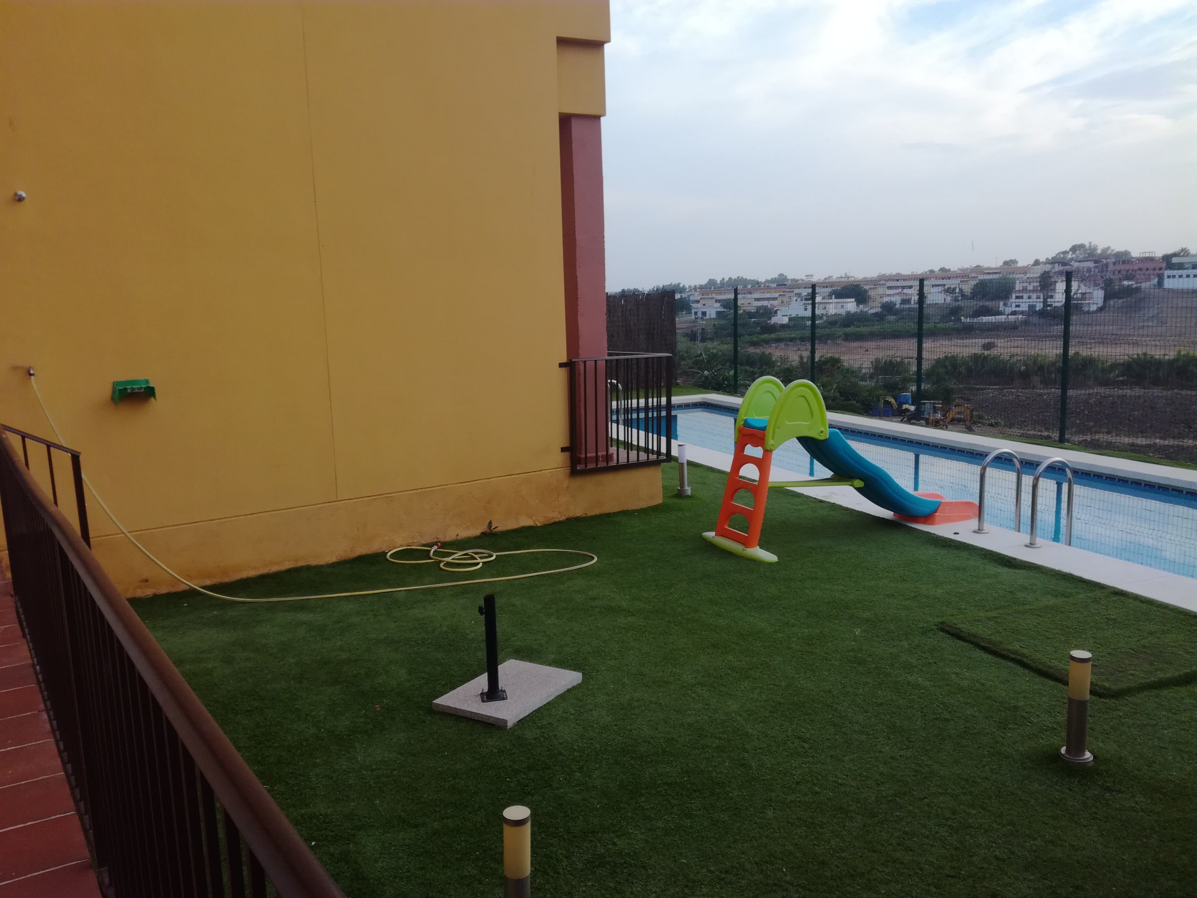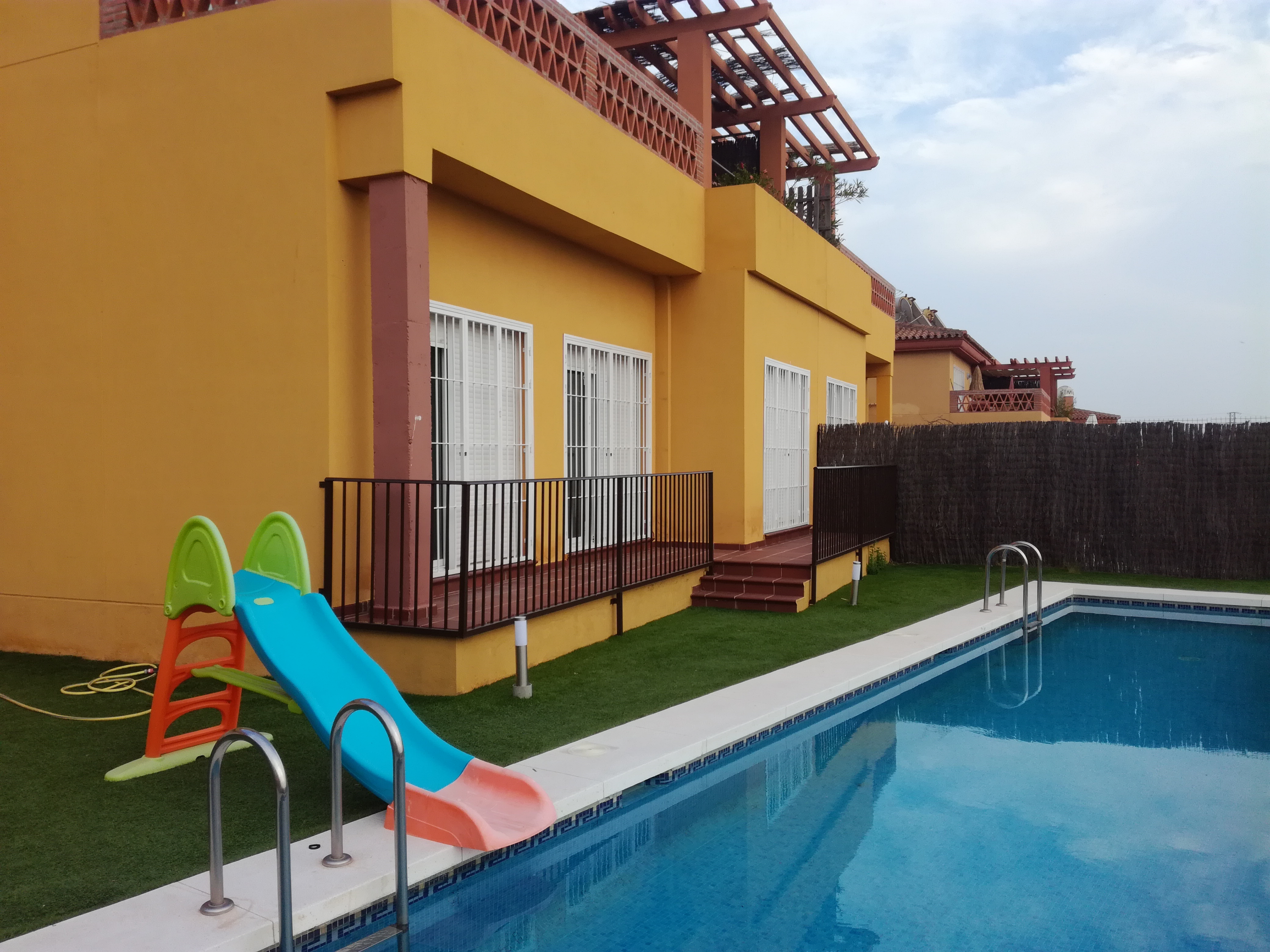 Vivienda de dos plantas construida en una parcela de 427 m2, con gran parking exterior para más de 1 coche, zona ajardinada y piscina privada.